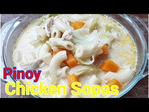 Filipino Chicken Macaroni Sopas - Chicken Noodle Soup With Evaporated Milk - This video will show you how to cook the Filipino version of chicken noodle soup. This is a special type of sopas composed of shredded chicken, chopped ham, ...